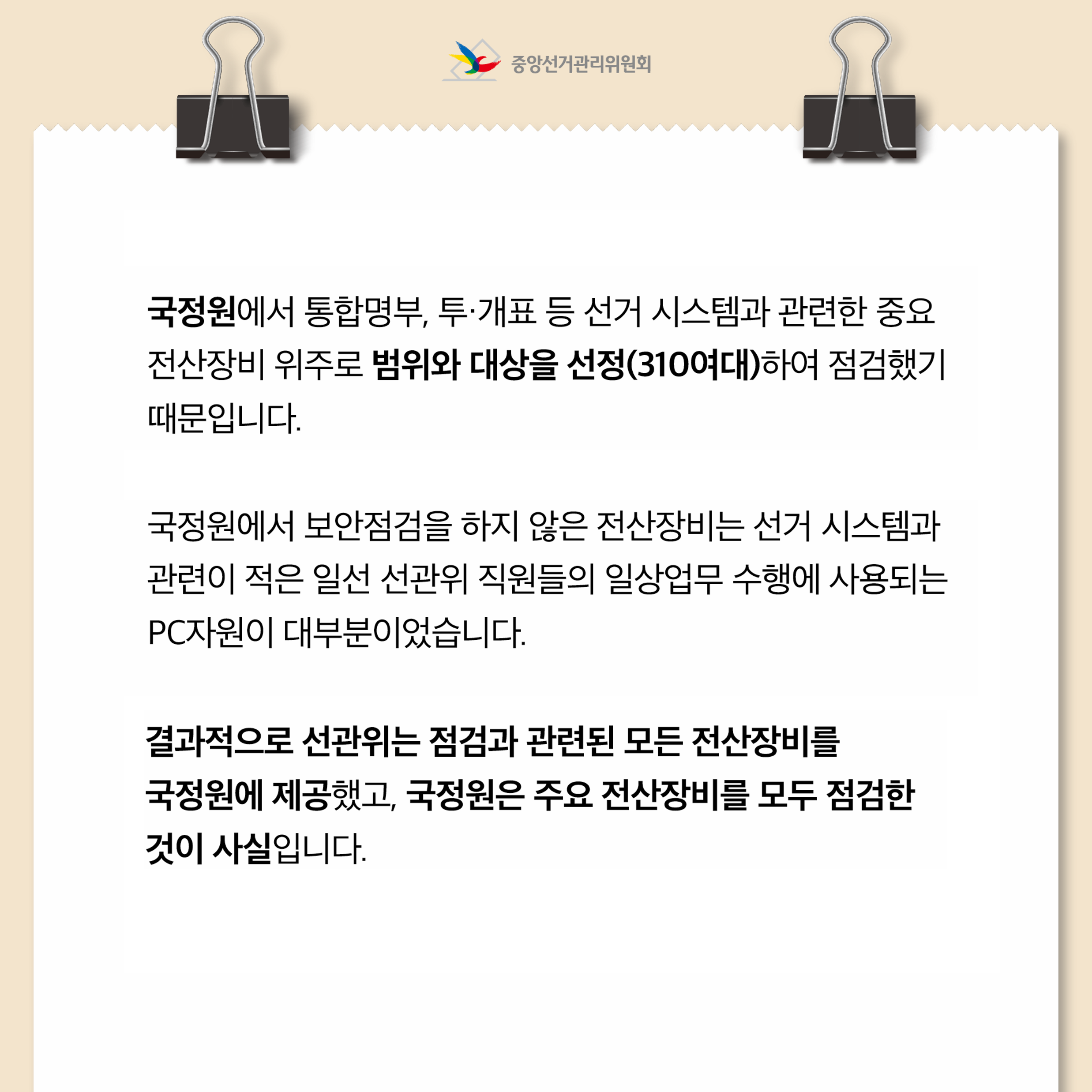 결과적으로 선관위는 점검과 관련된 모든 전산장비를 국정원에 제공했고, 국정원은 주요 전산장비를 모두 점검한 것이 사실입니다!
