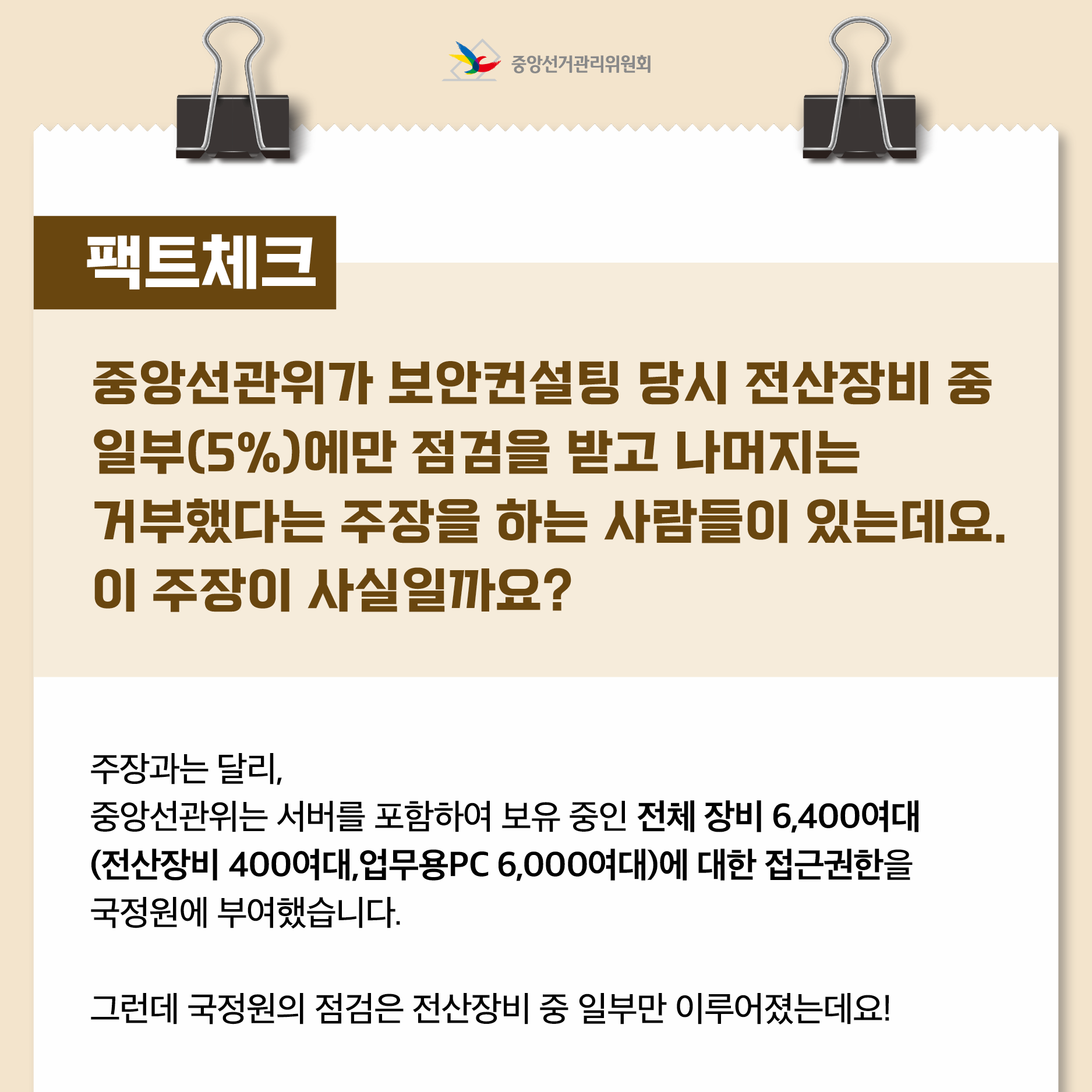 중앙선관위가 보안컨설팅 당시 전산장비 중 일부(5%)에만 점검을 받고 나머지는 거부했다는 주장을 하는 사람들이 있는데요. 이 주장이 사실일까요?