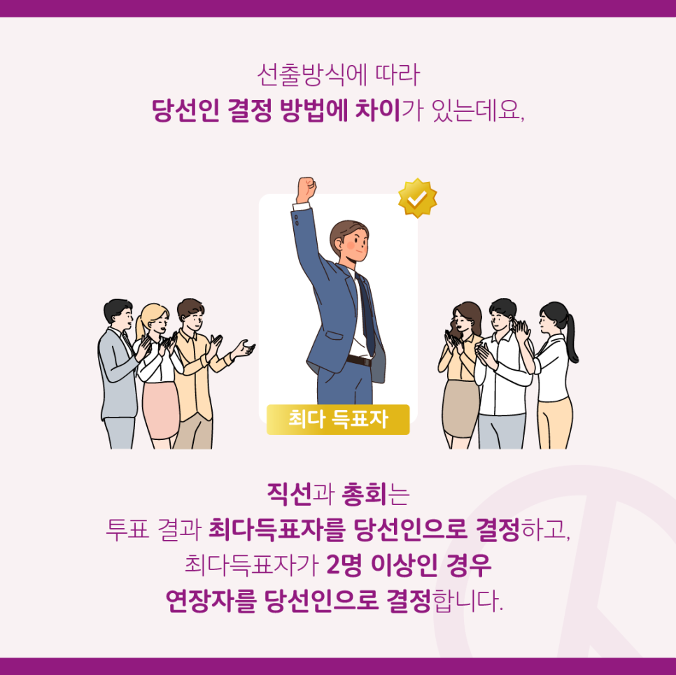 직선과 총회는 투표 결과 최다득표자를 당선인으로 결정하고 최다득표자가 2명 이상인 경우 연장자를 당선인으로 결정합니다