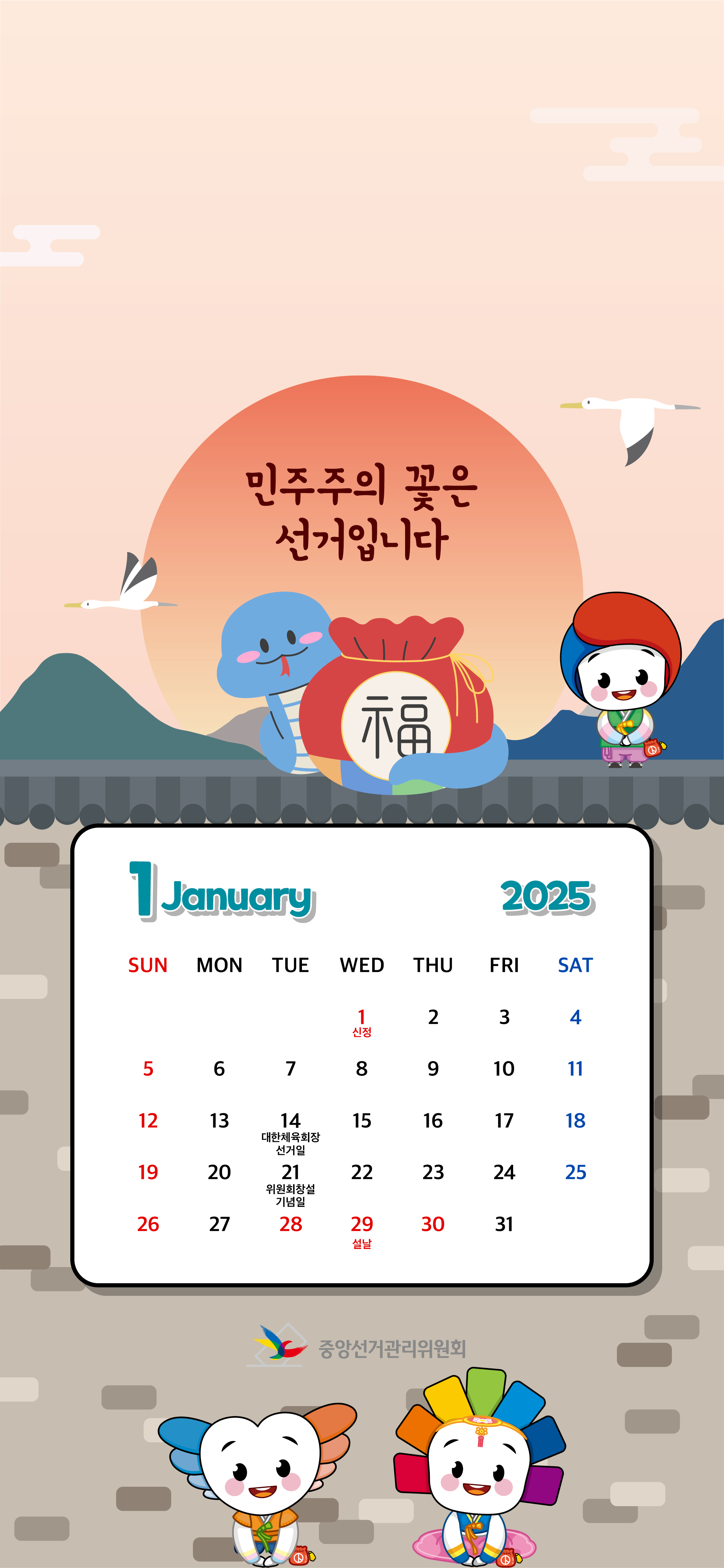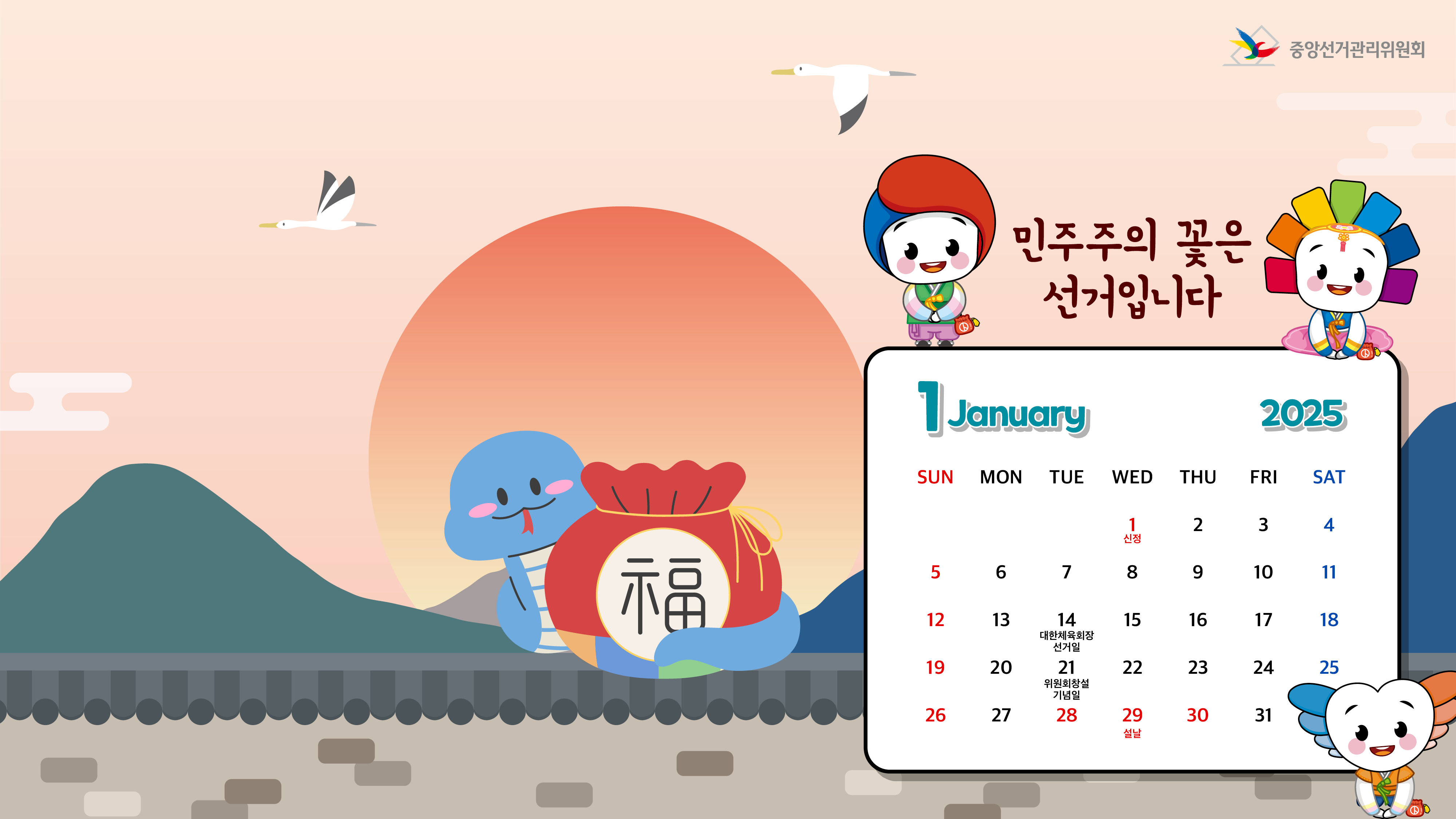 공공누리 마크 홍보과(02-3294-1034)에서 제작한 선거관리위원회 배경화면 달력(25년 1월) 저작물은 "공공누리" 출처표시-상업적 이용금지-변경금지 조건에 따라 이용할 수 있습니다. 자세한 내용은 [저작권정책]을 확인하십시오.