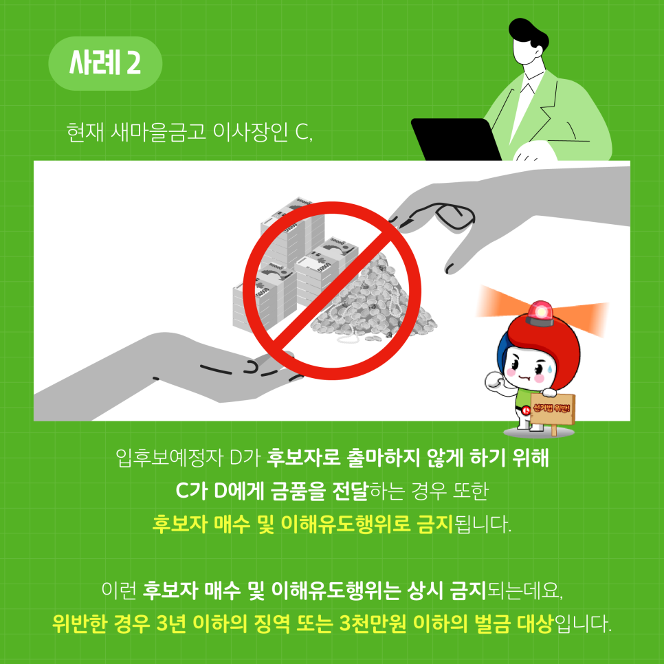 현재 새마을금고 이사장인 C, 입후보예정자 D가 후보자로 출마하지 않게 하기 위해 C가 D에게 금품을 전달하는 경우 또한 후보자 매수 및 이해유도행위로 금지됩니다.