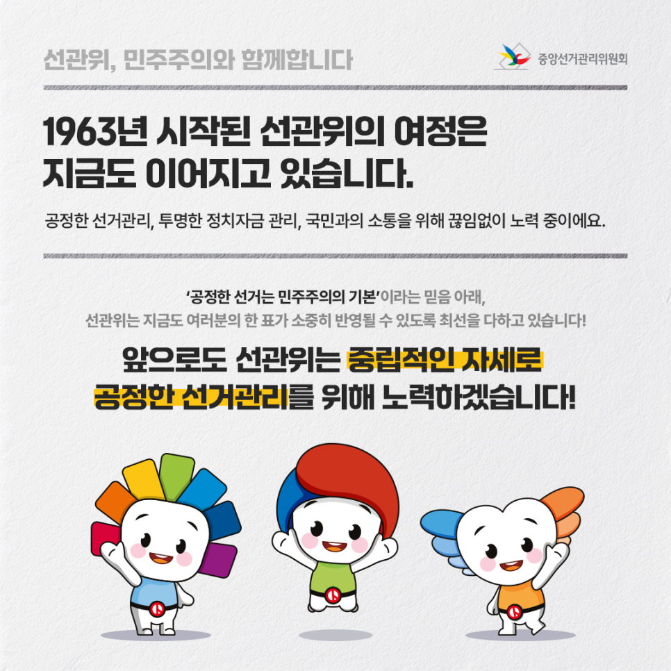 앞으로도 선관위는 중립적인 자세로 공정한 선거관리를 위해 노력하겠습니다!