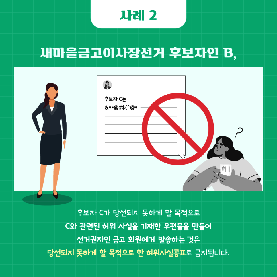 후보자 C가 당선되지 못하게 할 목적으로 C와 관련된 허위 사실을 기재한 우편물을 만들어 선거권자인 금고 회원에게 발송하는 것은 당선되지 못하게 할 목적으로 한 허위사실공표로 금지됩니다.