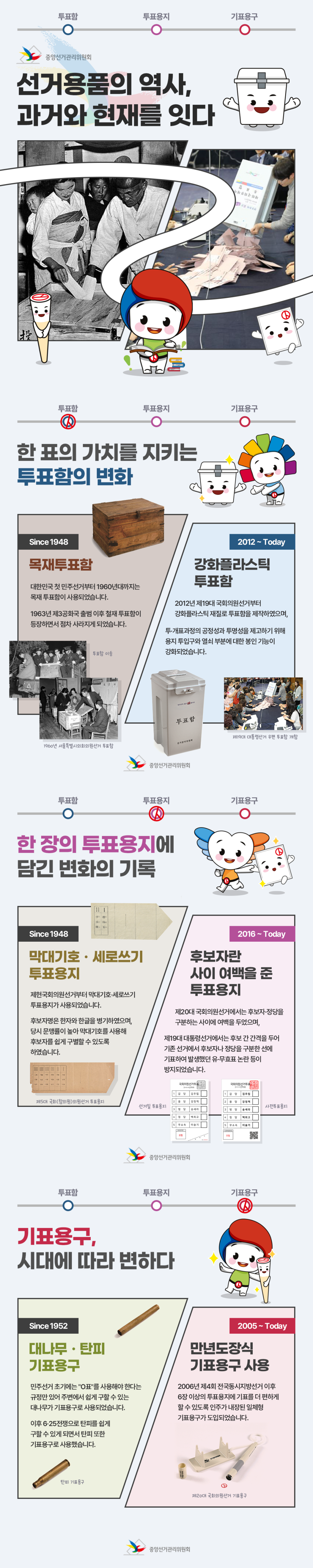 대한민국 첫 민주선거부터 1960년대까지는 목재 투표함이 제헌국회의원선거부터 막대기호·세로쓰기 투표용지가 사용되었습니다.