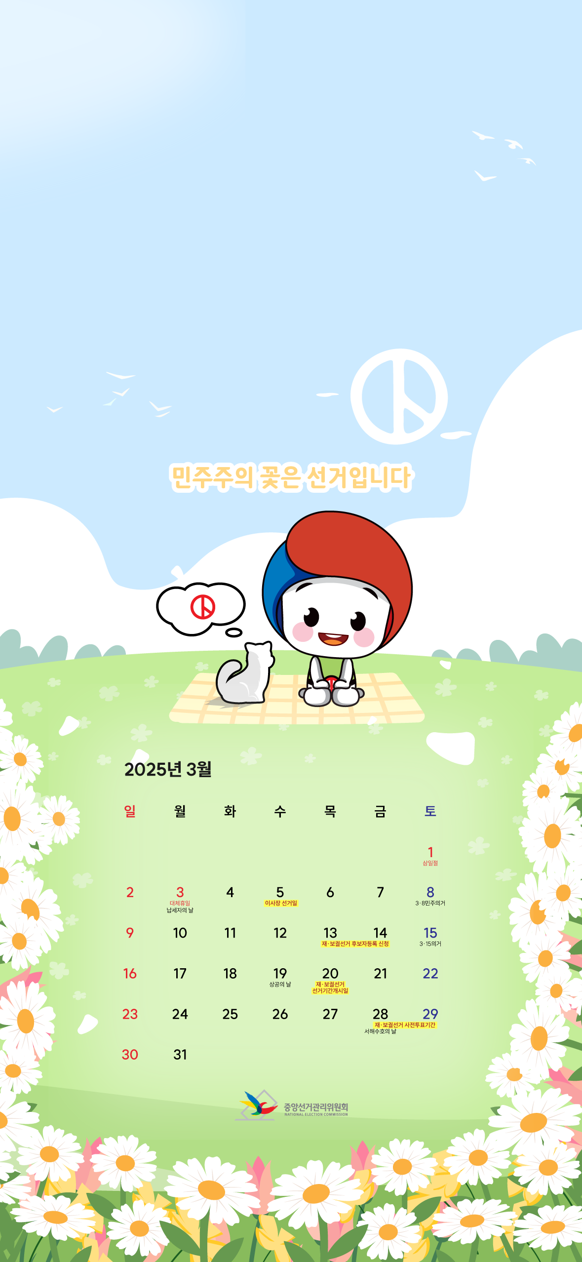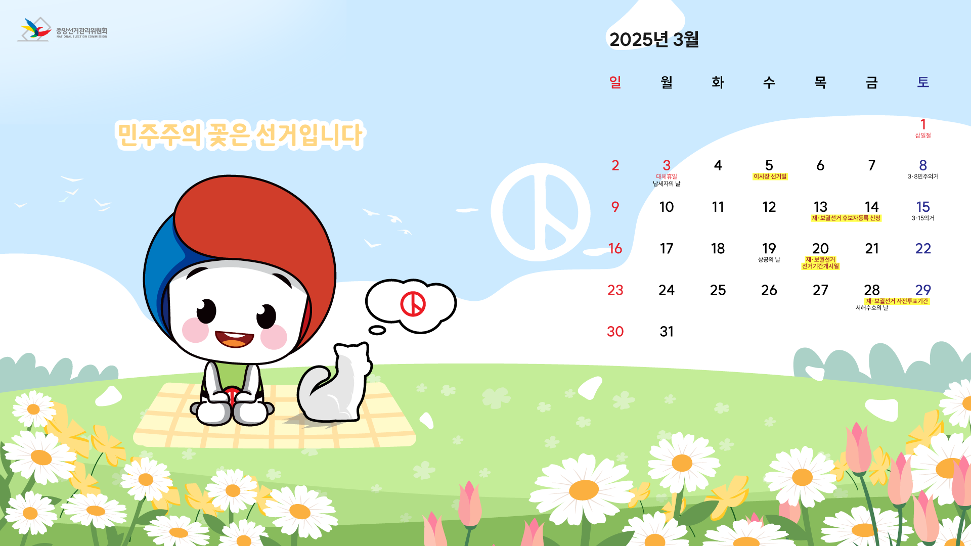 공공누리 마크 홍보과(02-3294-1034)에서 제작한 선거관리위원회 배경화면 달력(25년 3월) 저작물은 "공공누리" 출처표시-상업적 이용금지-변경금지 조건에 따라 이용할 수 있습니다. 자세한 내용은 [저작권정책]을 확인하십시오.