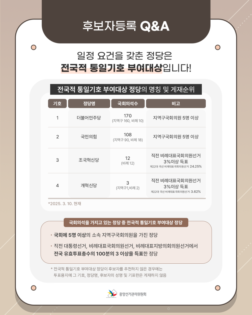 일정 요건을 갖춘 정당은 전국적 통일기호 부여대상입니다!