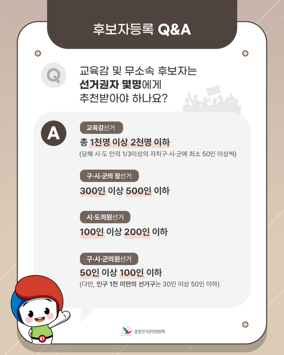 Q. 교육감 및 무소속 후보자는 선거권자 몇명에게 추천받아야 하나요?