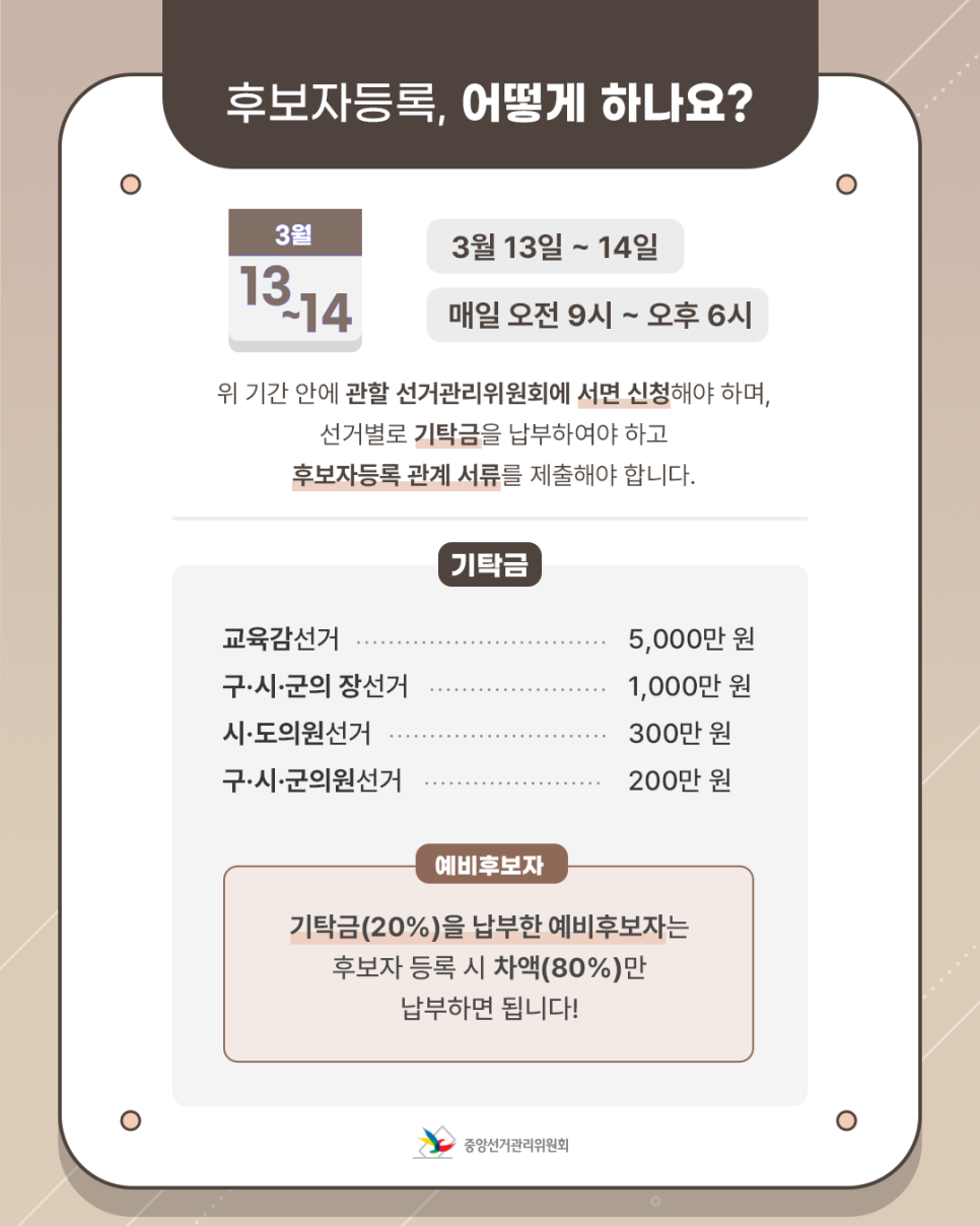기탁금(20%)을 납부한 예비후보자는 후보자 등록 시 차액(80%)만 납부하면 됩니다!
