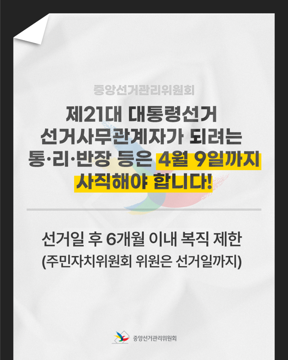제21대 대통령선거 선거사무관계자가 되려는 통·리·반장 등은 4월 9일까지 사직해야합니다.