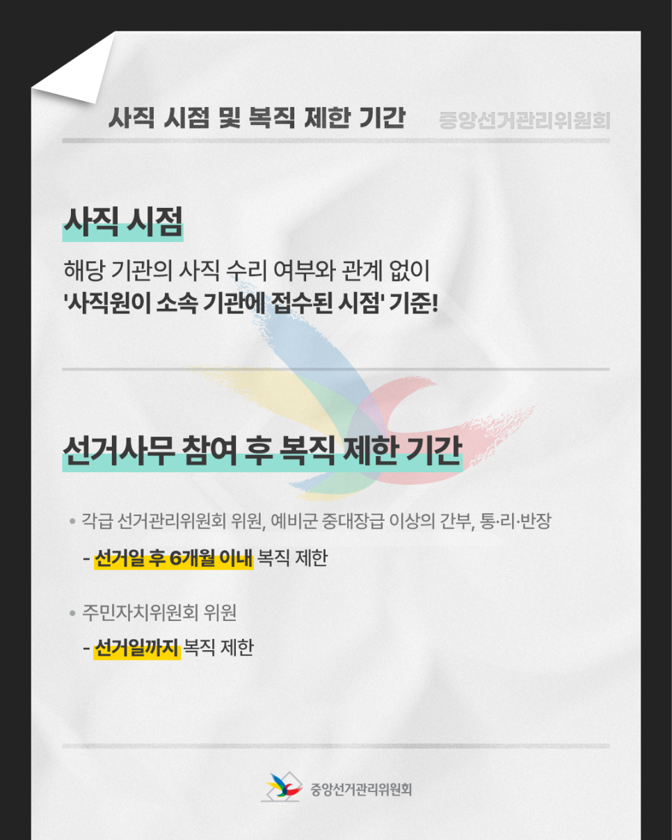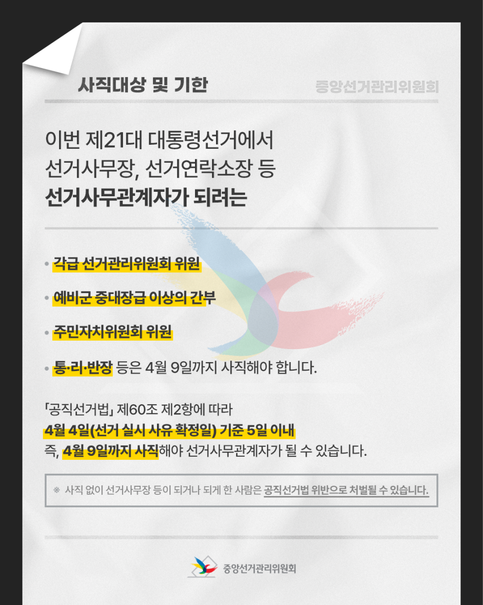 즉, 4월 9일까지 사직해야 선거사무관계자가 될 수 있습니다.