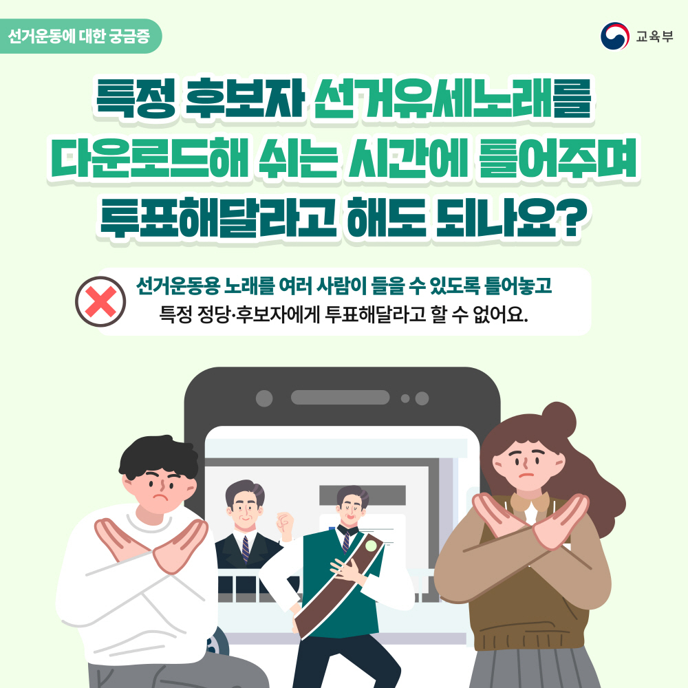 Q4. 특정 후보자 선거유세노래를 다운로드해 쉬는 시간에 틀어주며 투표해달라고 해도 되나요?