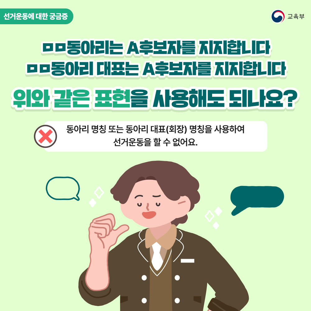 Q5. 우리 동아리 또는 동아리 대표가 A후보자를 지지합니다. 라는 표현을 사용해도 되나요?