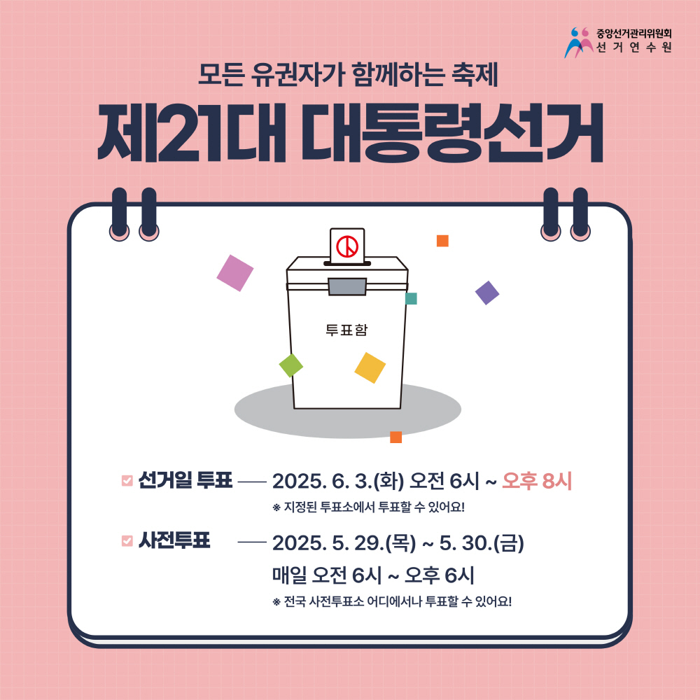 ○ 사 전 투 표 : 2025. 5. 29.(목) ~ 5. 30.(금) 오전 6시 ~ 오후 6시