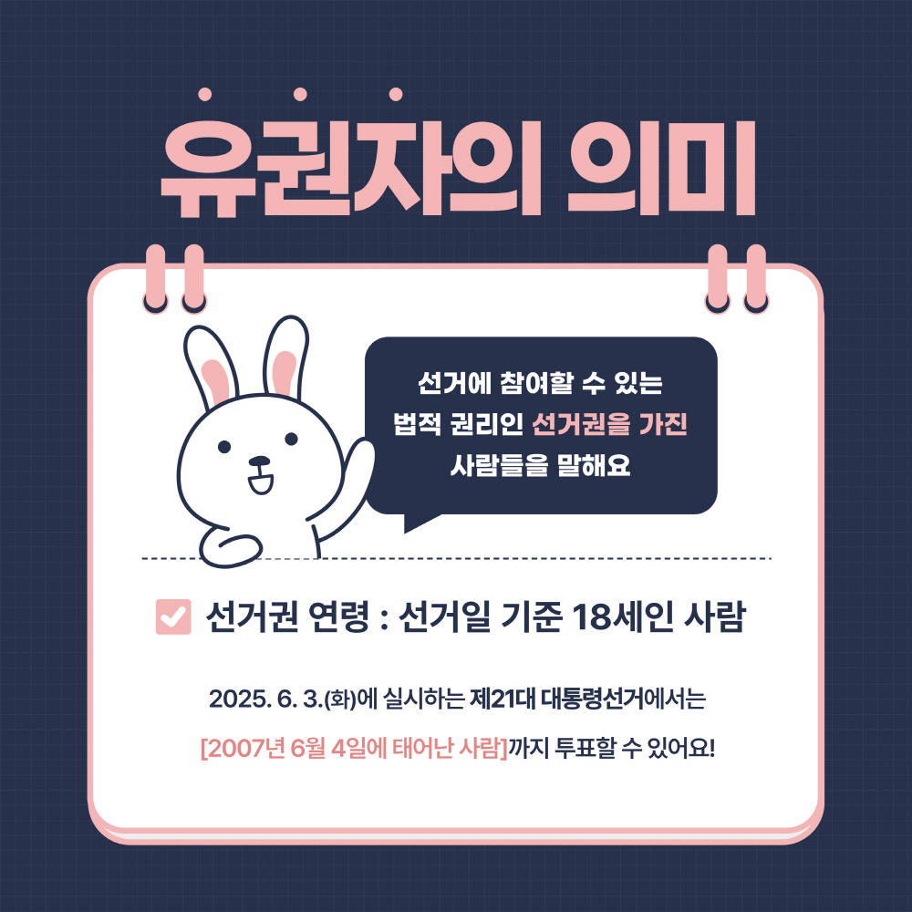 이번 2025. 6. 3. 제21대 대통령선거에서 유권자는 선거일 기준 18세인 사람이에요. 즉, 2007년 6월 4일에 태어난 사람까지 투표할 수 있어요.