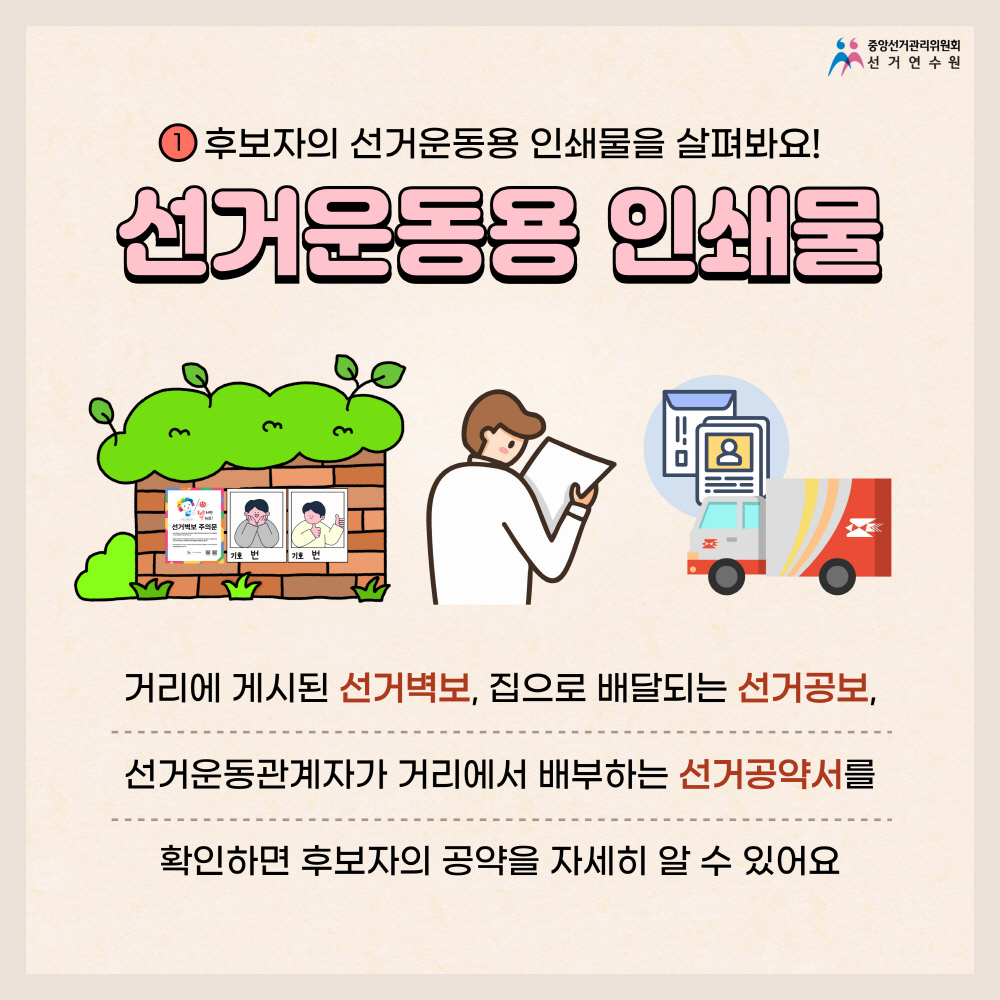 거리에 게시된 선거벽보, 집으로 배달되는 선거공보, 선거운동관계자가 거리에서 배부하는 선거공약서를 보면 후보자의 공약이 자세히 나와 있어요