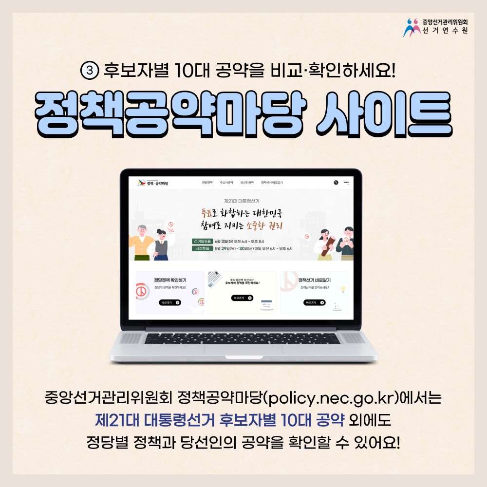 중앙선거관리위원회 정책․공약마당(policy.nec.go.kr)에서 후보자의 10대 정책과 공약을 비교·확인해 보세요(홈페이지 화면 캡쳐)