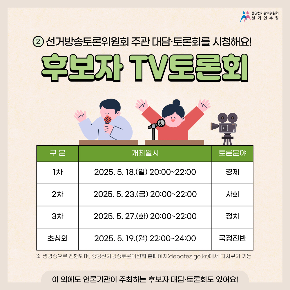 - 초청외 : 2025. 5. 19.(월) 22:00~24:00 / 토론분야 국정전반