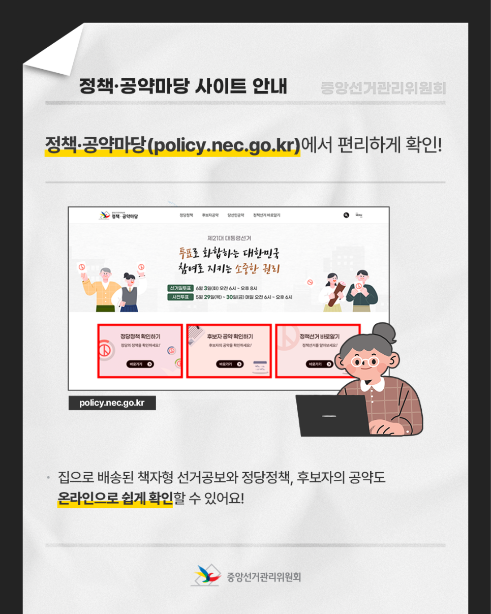 선거공보, 정당정책, 후보자의 공약을 집에서도 정책·공약마당에서 쉽게 확인할 수 있어요!