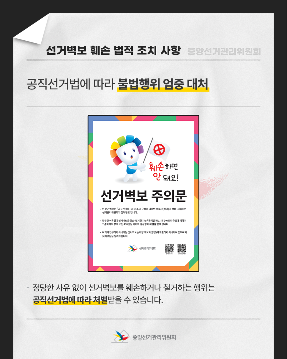 ✅ 하지만 벽보를 찢거나 훼손하면 공직선거법에 따라 처벌될 수 있어요.