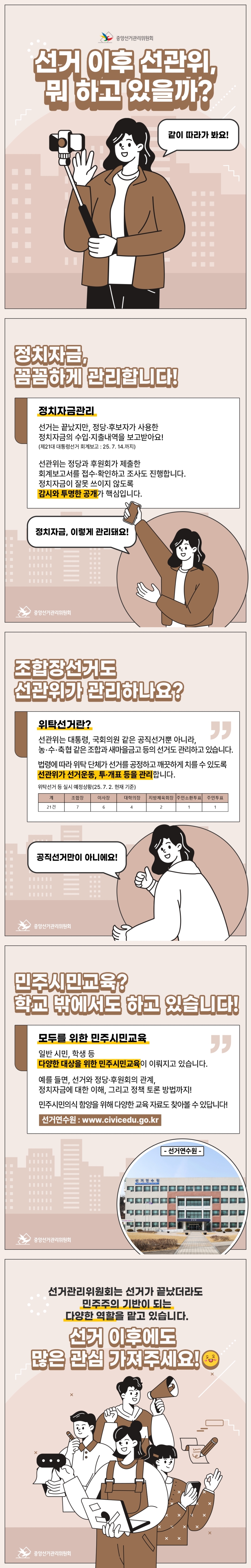 선관위는 선거 이후에도 민주주의 기반이 되는 다양한 역할을 맡고 있습니다!