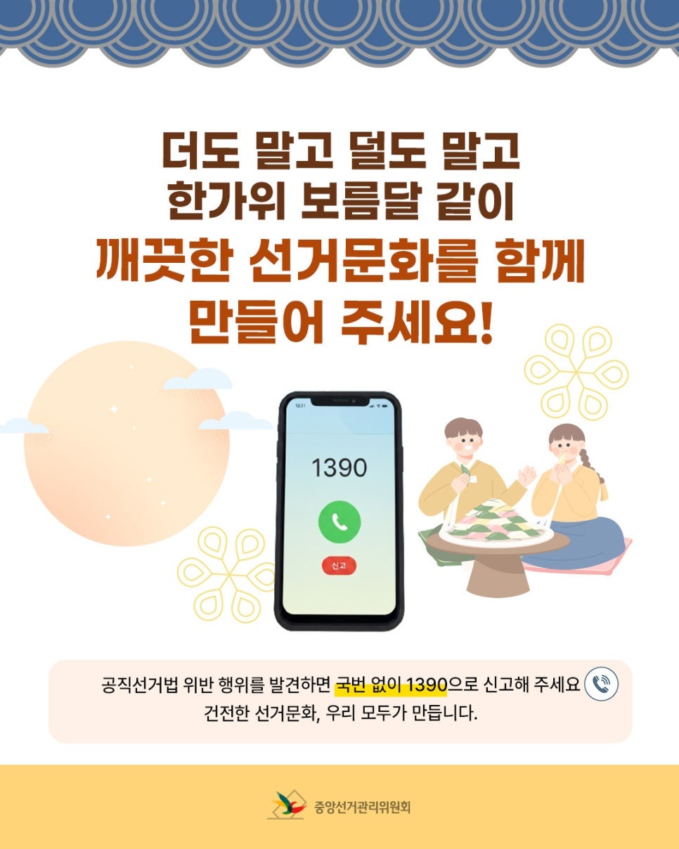 공직선거법 위반 행위를 발견하면 국번 없이 1390으로 신고해 주세요