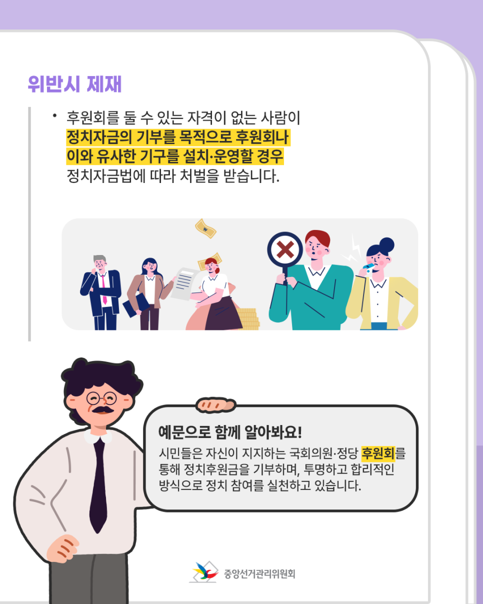후원회를 둘 수 있는 자격이 없는 사람이 정치자금의 기부를 목적으로 후원회나 이와 유사한 기구를 설치·운영한 사람은 정치작므법에 따라 처벌을 받습니다.
