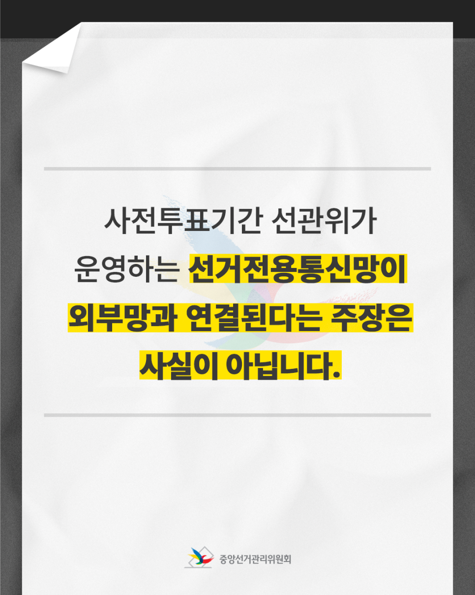 사전투표기간 선관위가 운영하는 선거전용통신망이 외부망과 연결된다는 주장은 사실이 아닙니다.