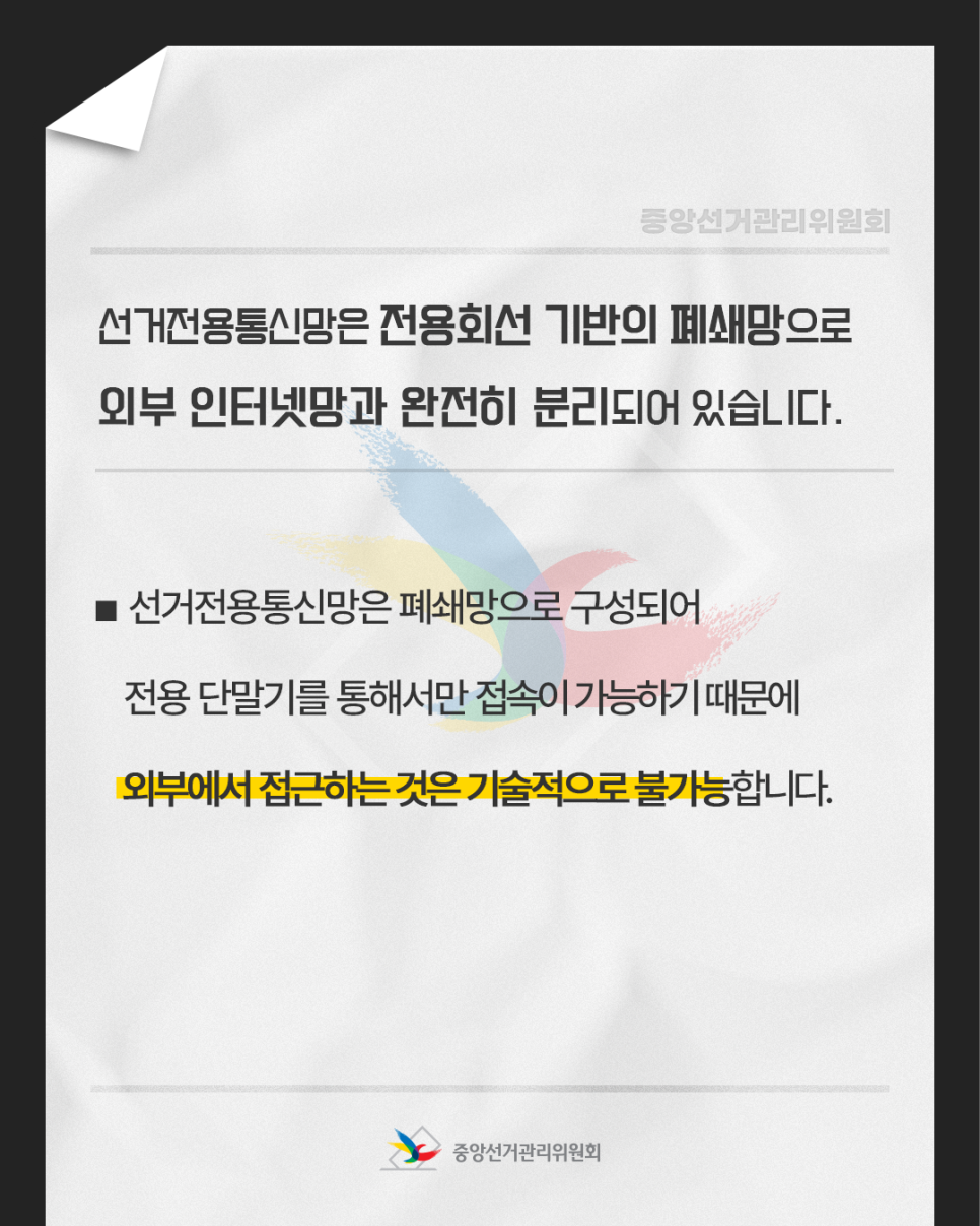 선거전용통신망은 전용회선 기반의 폐쇄망으로 외부 인터넷망과 완전히 분리되어 있습니다.