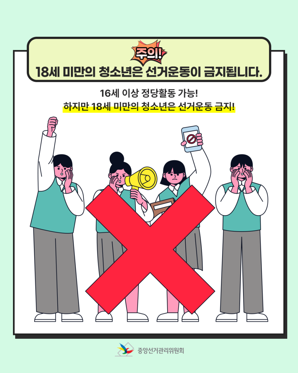 하지만 18세 미만의 청소년은 선거운동 금지!