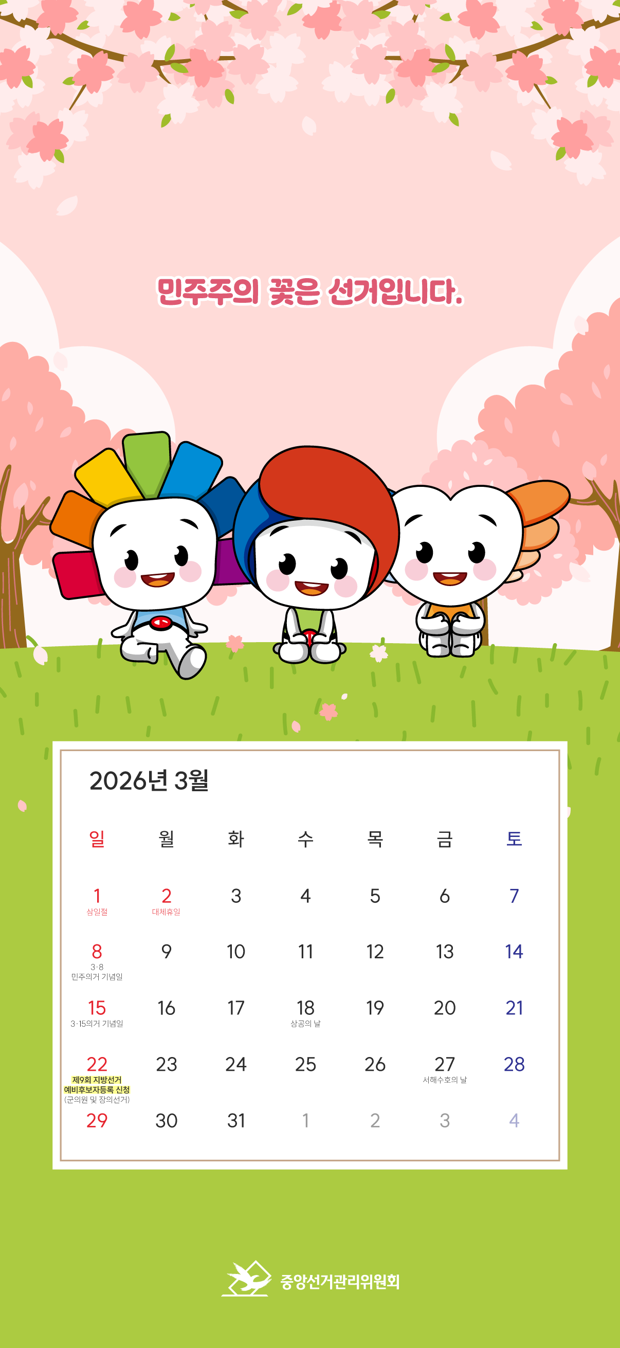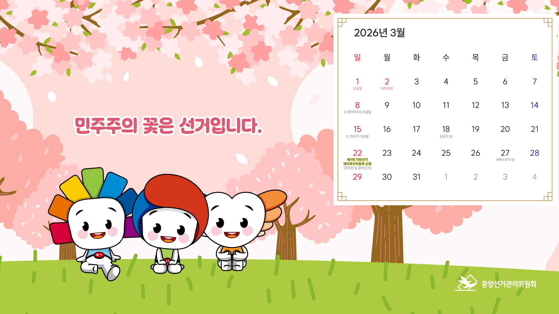 공공누리 마크 홍보과(02-3294-1034)에서 제작한 선거관리위원회 배경화면 달력(26년 3월) 저작물은 "공공누리" 출처표시-상업적 이용금지-변경금지 조건에 따라 이용할 수 있습니다. 자세한 내용은 [저작권정책]을 확인하십시오.