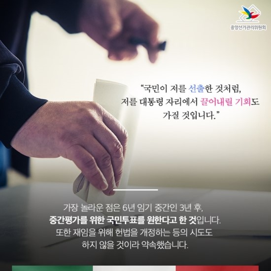 그는 임기 중 중간평가를 위한 국민투표를 제안했는데요~