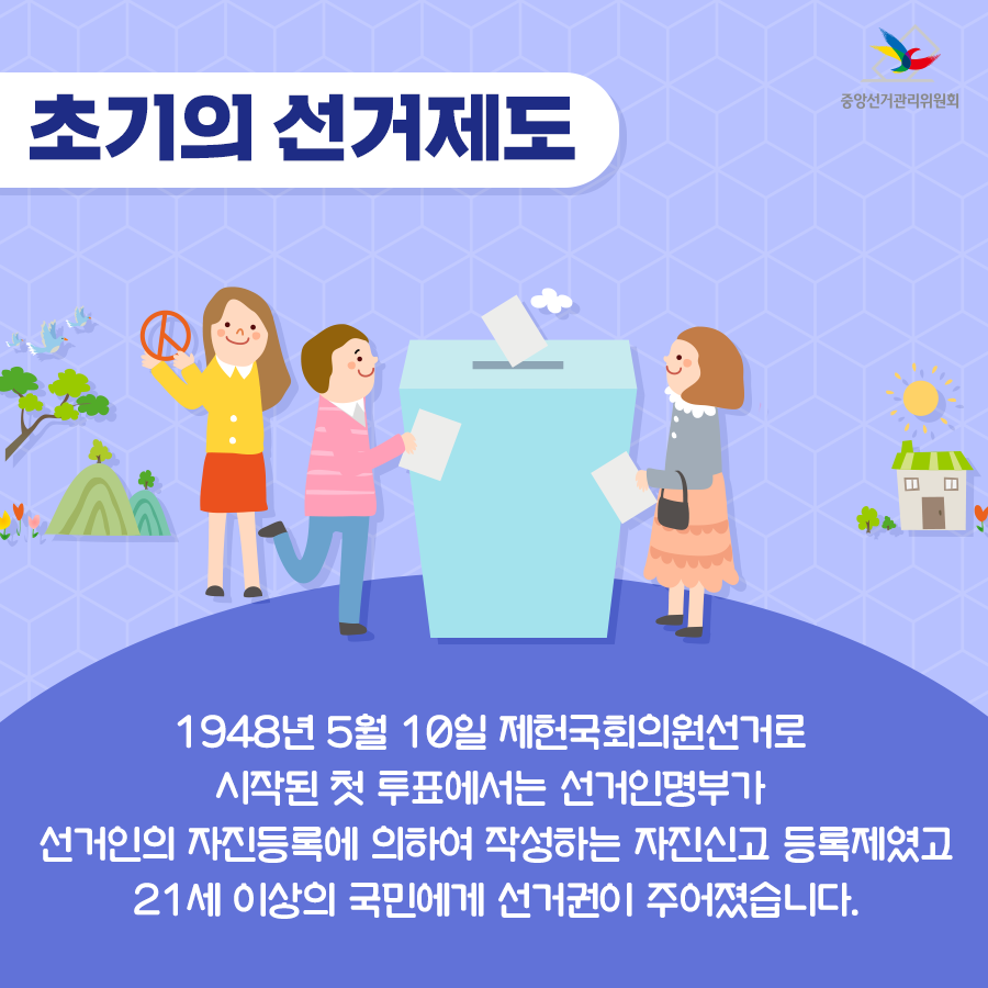 1948년 5월 10일 제헌국회의원선거로 시작된 첫 투표에서는 선거인명부가 선거인의 자진등록에 의하여 작성하는 자진신고 등록제였고 21세 이상의 국민에게 선거권이 주어졌습니다.