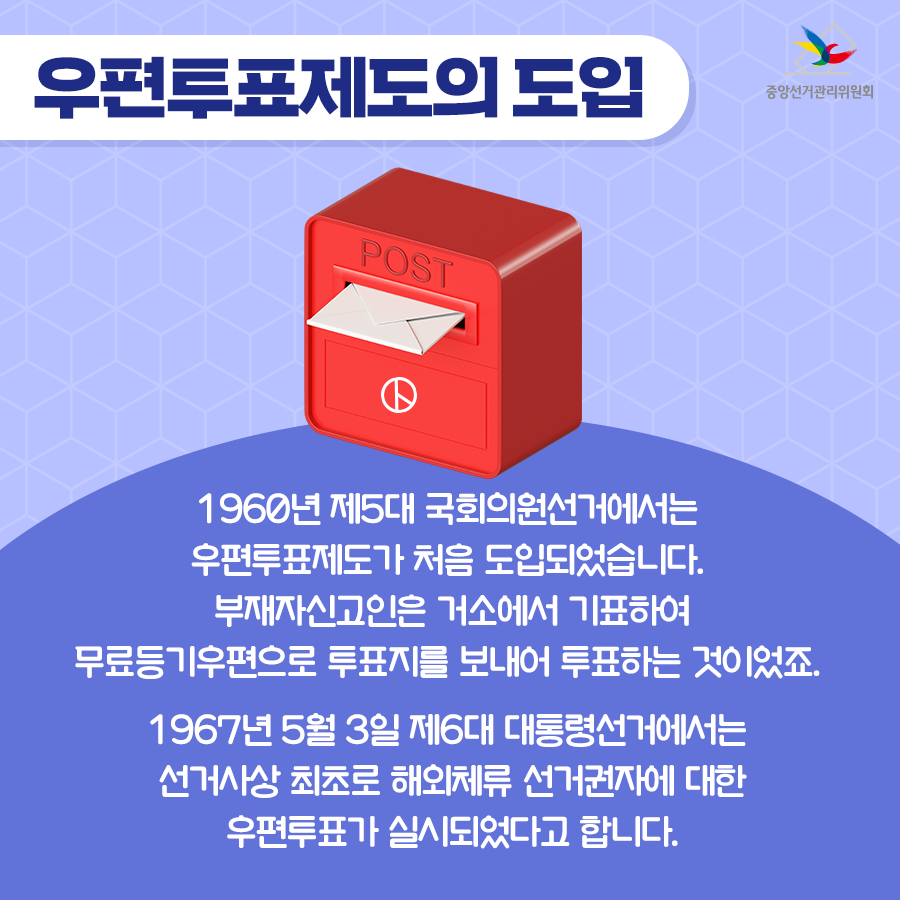 1960년 제5대 국회의원선거에서는 부재자우편투표제도가 처음 도입되었습니다. 부재자신고인은 거소에서 기표하여 무료등기우편으로 투표지를 보내어 투표를 하면 되는 것이었는데요.