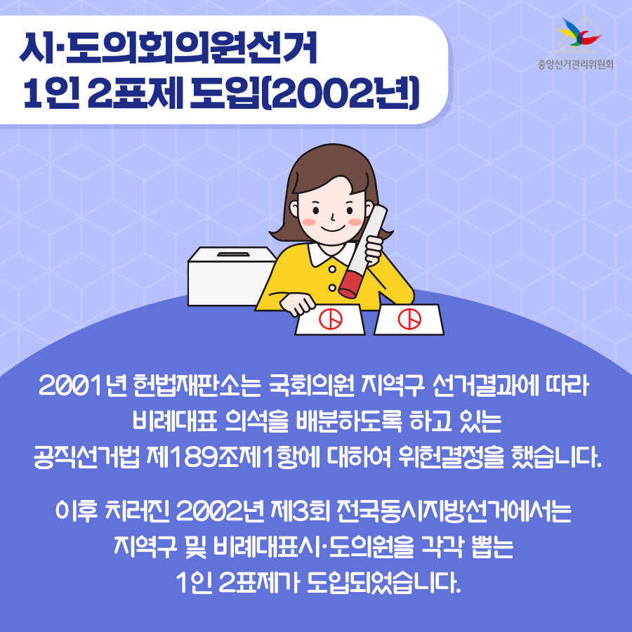 이에 따라 2002년 공직선거법이 개정되고 2002년 6월 13일 실시한 제3회 전국동시지방선거에서 지역구 및 비례대표시•도의원을 각각 뽑는 1인 2표제(정당에 한 표, 후보자에게 한 표)가 도입되었습니다. 그리고 이는 이후 국회의원선거와 구•시•군의회의원선거까지 확대되어 오늘에 이르고 있습니다.