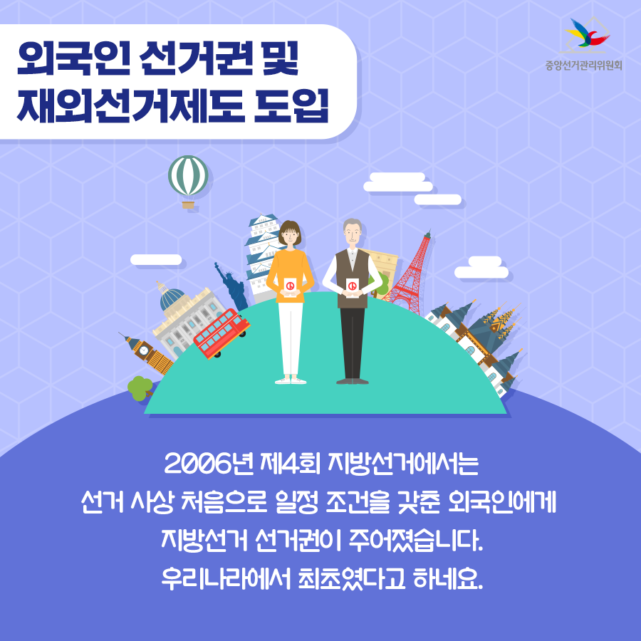이렇게 외국인에게 선거권을 부여한 것은 우리나라가 아시아에서 최초라고 합니다. 그리고 2009년에는 공직선거법 개정으로 2012년 제19대 국회의원선거부터 재외선거제도가 도입되었습니다.