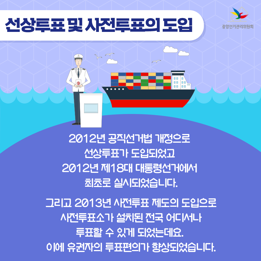 우리나라는 현재 바다 위 선상과 지역과 상관없는 장소에서 투표할 수 있는 시대가 되었습니다. 2012년 공직선거법 개정으로 선상투표가 도입되어 2012년 12월 19일 제18대 대통령선거에서 최초로 실시되었기 때문입니다.